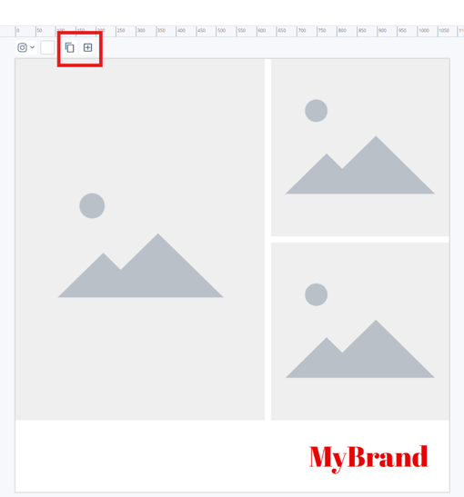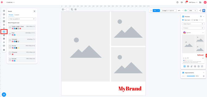 - Access Creatives and select an existing layout or create a new one. Ensure that the first design is set to a 1:1 format as this design will be used as the main image link. You can verify the layout format from the Resize tab.