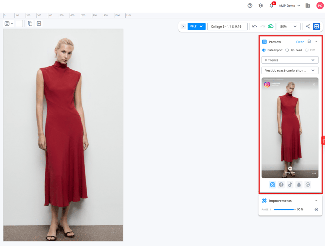 - Click on the Preview menu, located on the right-hand side of the tool, to review how the elements will be displayed. You can preview the design using a random product from the Data Import preview or select a specific product ID from the Optimized Feed preview. Below the canvas, you will see how the ad will be rendered on the platform.