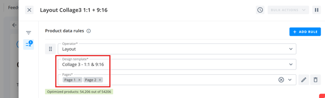 - Once the design is ready, navigate to Feeds to apply the layouts to your product set. Create a new Optimization with a layout transformation and select the recently created multipage design. Choose all the image assets you want to apply.