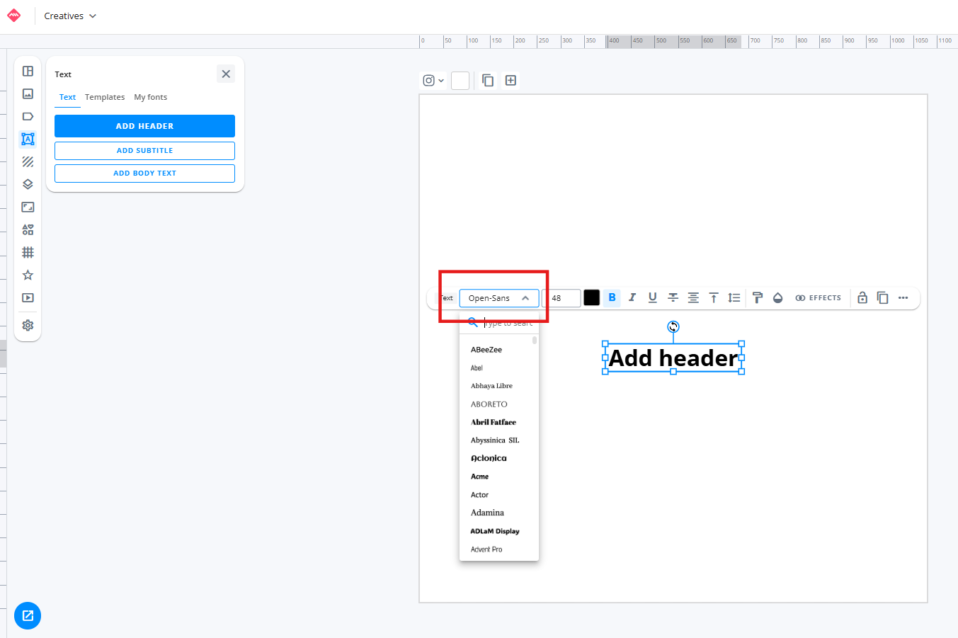 - Use the uploaded font. Add a text box from the Text tab and select your custom font from the font dropdown menu in the top toolbar.